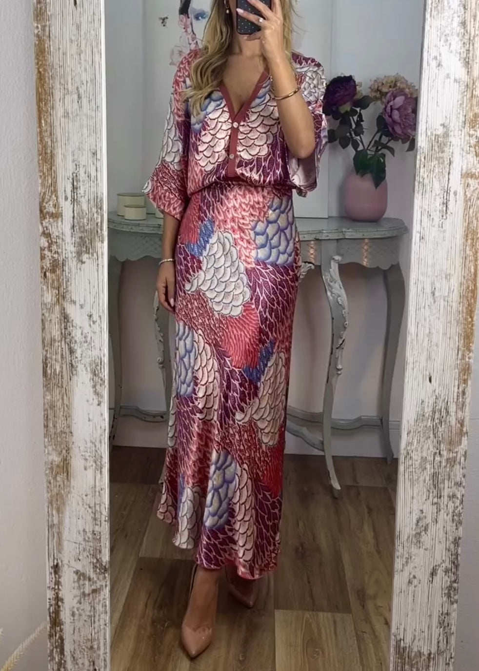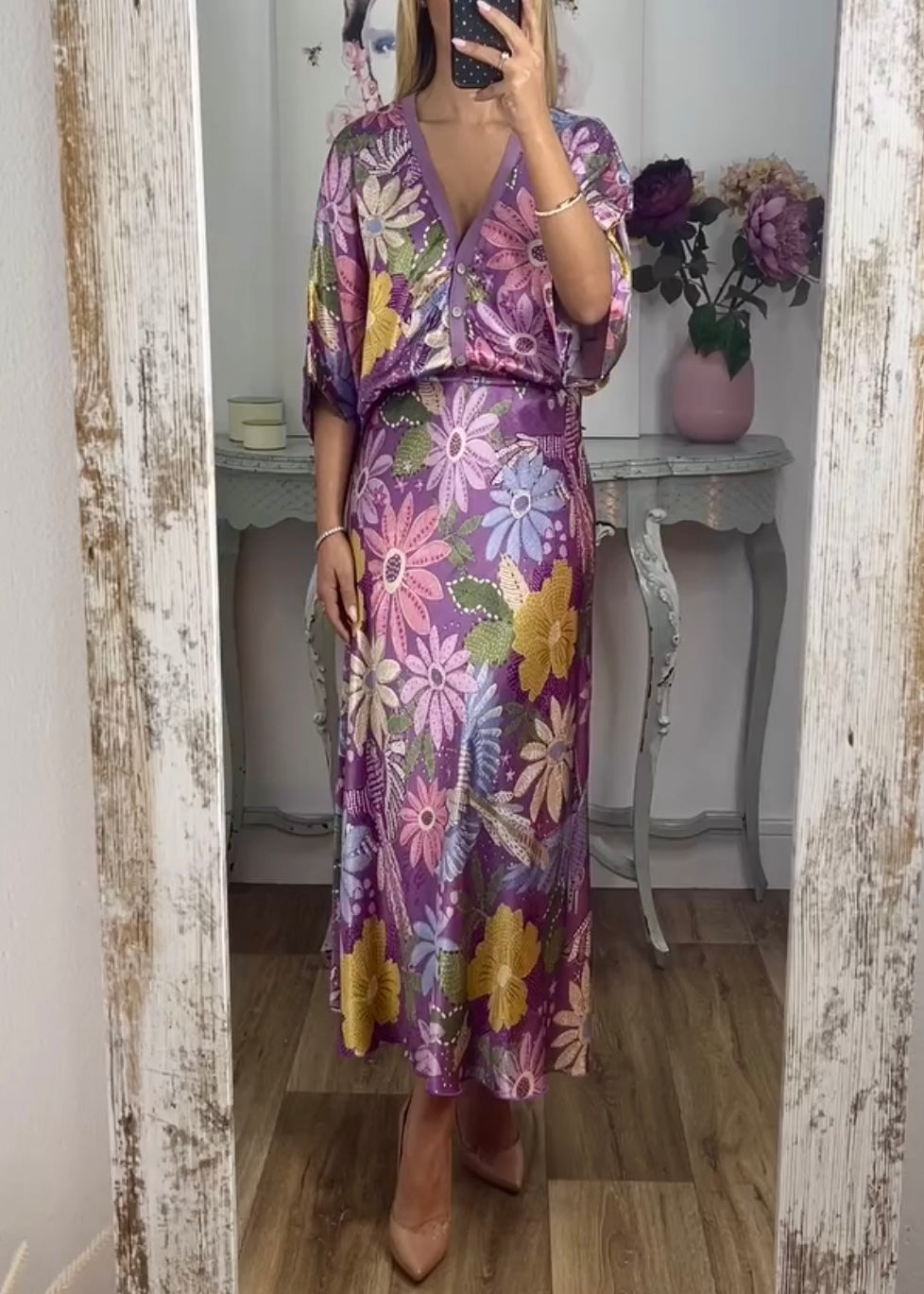 The thoughtfully designed fit offers gentle movement and flattering structure, with the soft fabric gliding comfortably against the skin. The button-front top adds versatility, allowing it to be worn loosely for a relaxed look or styled neatly for a more elevated finish. The skirt’s fluid shape ensures graceful movement, making it ideal for events, evenings out, or daytime gatherings.