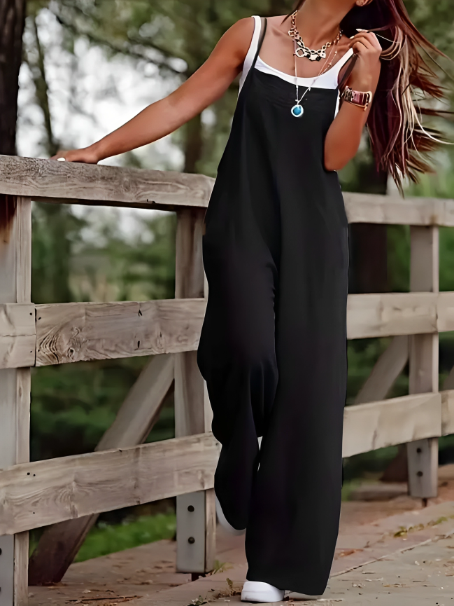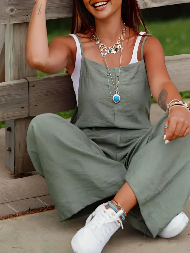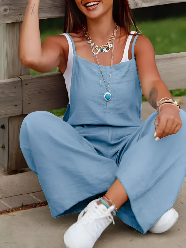 Perfect for spring and summer, this jumpsuit combines comfort, versatility, and effortless style in one timeless piece. Whether worn for travel, beach strolls, or daily errands, it delivers a balance of ease and elegance that fits seamlessly into any modern wardrobe.