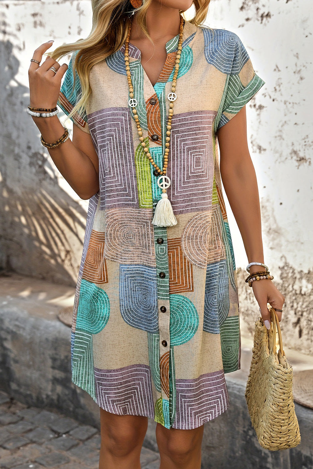 The modern geometric print adds a touch of artistic flair, making this piece stand out while still being easy to style. The soft texture and natural drape of the fabric create a casual yet polished look that transitions beautifully from beach strolls to café outings. Subtle design details such as the curved hemline and structured neckline enhance the overall style, giving it a refined yet easy-going appeal.